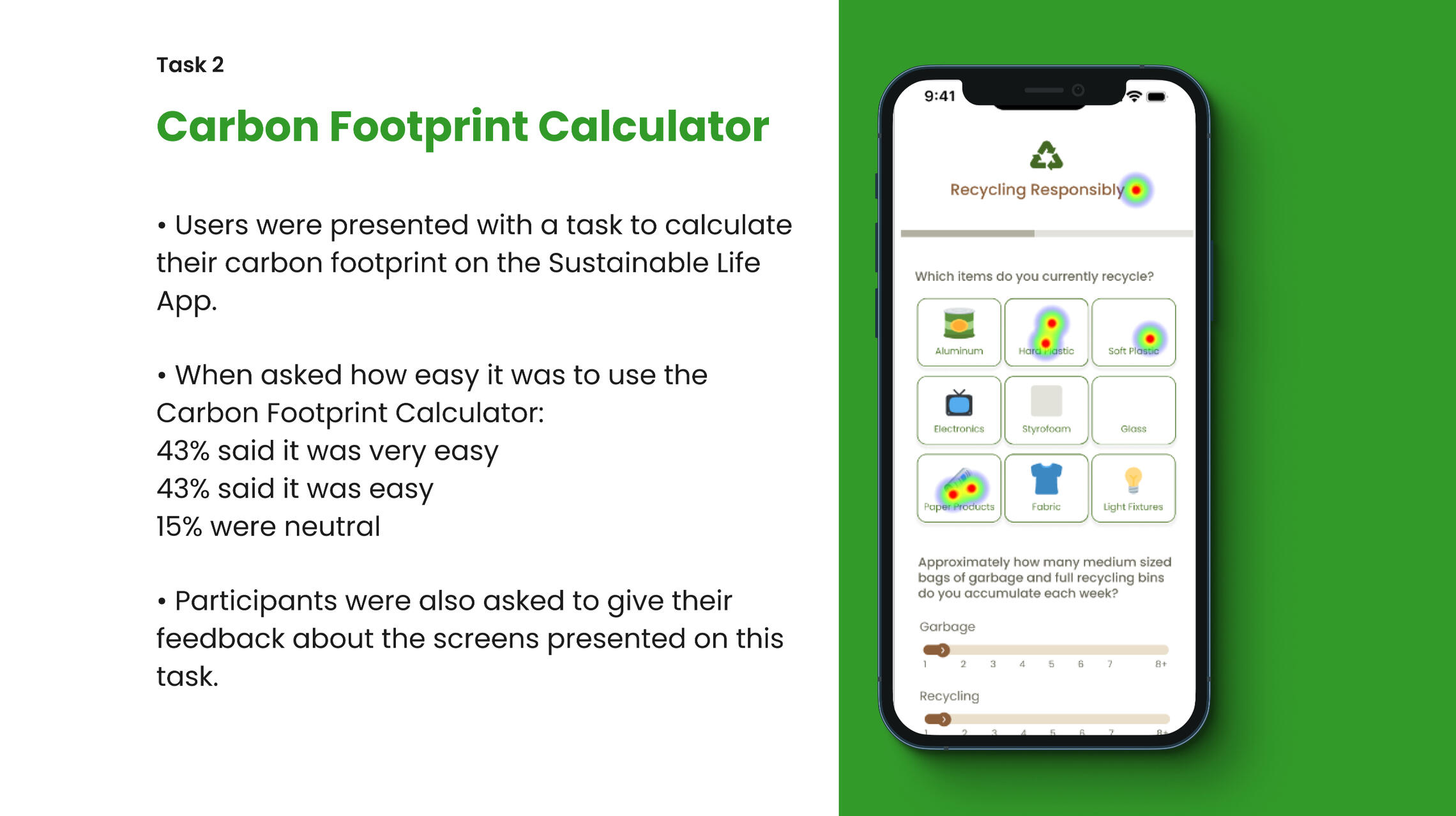 A usability testing was performed to validate the design choices for the new interface of Sustainable Life App, especially related to the new feature being implemented, the Carbon Footprint Calculator. The testing was hosted on Useberry, a platform that enables participants to enroll remotely in their own time and devices, performing tasks established by the UX Designer.After gathering the results, an iteration process was performed to align the design with users' feedback and the client's wishes.