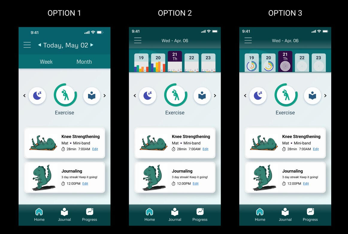 We presented our prototypes using Maze to 9 individuals for usability testing, and our focus areas were onboarding, homepage, exercise routine, journaling, and food logging. The results of this testing would be used for further design iteration.After presenting high-fidelity prototypes to the client, A/B Testing was requested for the activity tracker on the homepage. Three options were presented to users, and Option 2 was preferred.